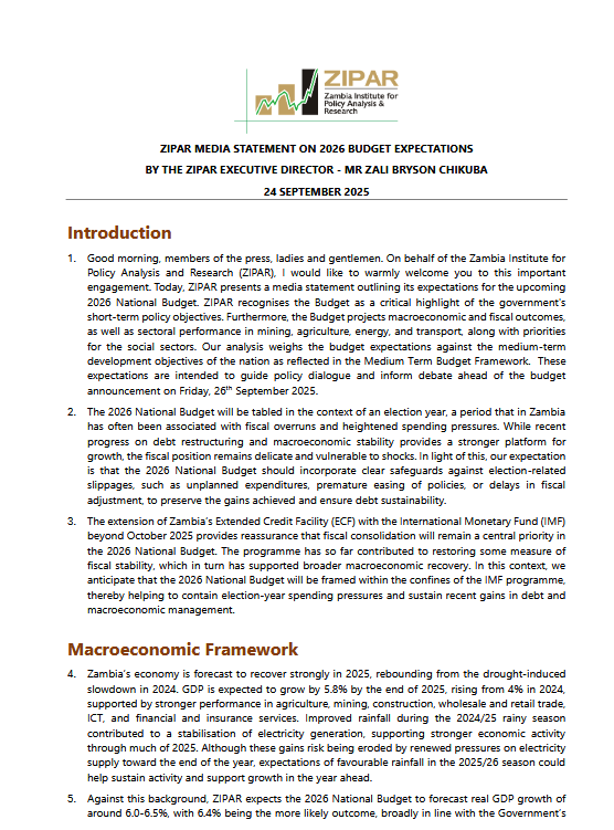 ZIPAR 2026 Budget expectations statement File size: 175.25 KB Created: 24-09-2025 Updated: 24-09-2025 Hits: 102 Download Preview